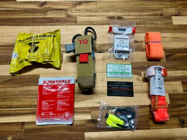Five organized first aid kits laid out on a floor in front of a fireplace.